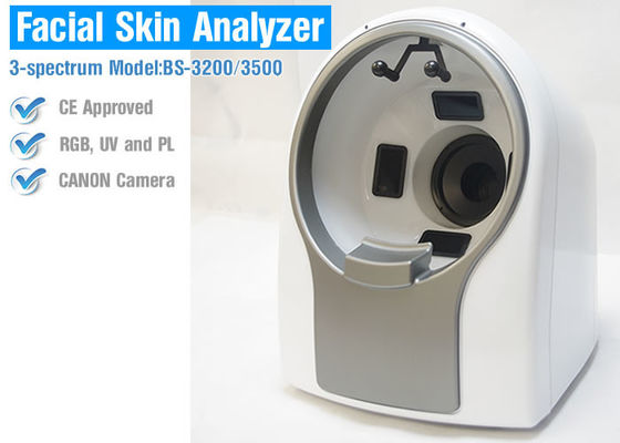 The BS-3200 facial skin analysis system utilizes skin care photographic imaging tool that provides clinical measurement of surface and subsurface facial skin conditions, using digital images technologies via RGB visible light, PL polarized light, and UV spectrum. In use by cosmetic surgeons, dermatologists, and other medical and skin care professionals, the BS-3200 system is a self-contained unit that captures multi-spectral photos of the face, examining the complexion for wrinkles, spots, pores, texture, porphyrins (evidence of bacteria in pores), UV spots (characteristic of photodamage, typically from overexposure to sun), pigmented spots and acne. Additionally, it grades an individual’s skin features relative to others of the same age and skin type.
